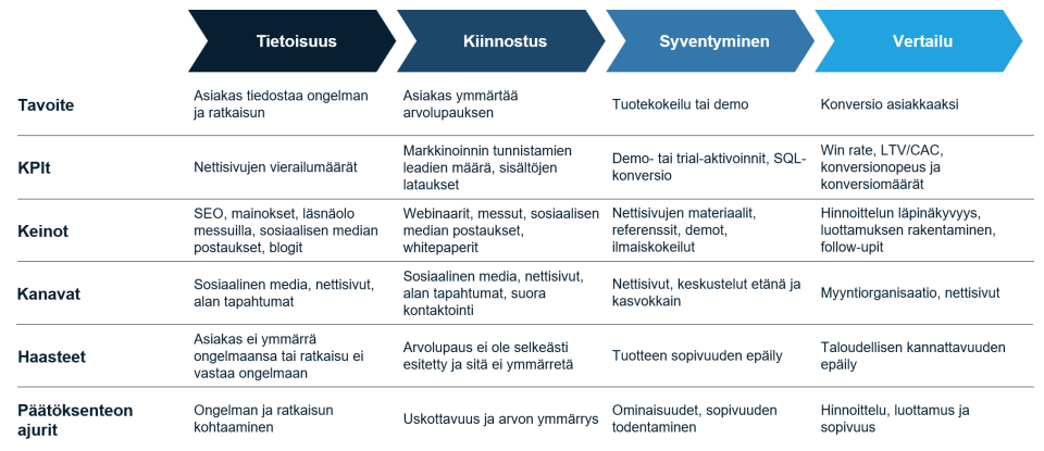Voittava SaaS-markkinointimalli perustuu jatkuvaan mittaamiseen, rohkeisiin kokeiluihin ja asiakkaan ostopolun ymmärtämiseen. Rakenna suppilo vaihe vaiheelta ja keskity oikeanlaiseen viestintään, ja varmistat parhaat tulokset: tunnettuudesta arvolupaukseen ja demosta pysyvään asiakkuuteen.